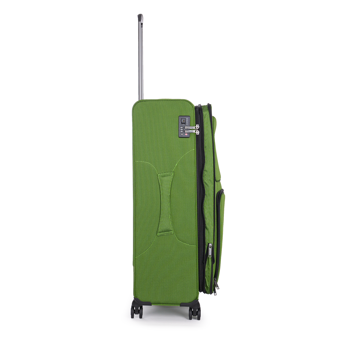 Ein leichtläufiges, 360° drehbares, 4-Doppelrollensystem und ein ergonomisch geformter Griff, an einem arretierbaren 3-Punkt Teleskopgestänge aus Aluminium, lassen den super leichten BENDIGO LIGHT+-Koffer, Größe L, sehr komfortabel führen und auch voll bepackt ist er so sehr wendig und leichtläufig. Die Teleskopgestänge der BENDIGO LIGHT+ Serie sind zudem so angelegt, dass sich auch zwei Koffer der Serie zeitgleich mit nur einer Hand ziehen lassen. Größe L verfügt zudem über ein bis zu 114cm ausfahrbares Gestänge, welches damit das weltweit höchste Teleskopgestänge bei einem Koffer ist. Zwei aufgesetzte Fächer für den schnelleren Zugriff auf Reisen sind mit einem hochwertigen Reißverschluss versehen. Das sehr geräumige Hauptfach des BENDIGO LIGHT+ ist mit feingewebtem Polyester und einem 2-Wege-Reißverschluss ausgestattet. Im Kofferinnenraum befinden sich ein Reißverschluss-Hauptfach und ein Reißverschluss- Hemdenfach mit hoch belastbaren Kreuzspanngurten. Für höchstes Packvolumen ist der BENDIGO LIGHT+ über einen zusätzlichen Reißverschluss am Deckelfach noch größentechnisch erweiterbar. Die Ausstattung mit einem TSA-Schloss für Reisen in die USA und Großbritannien ist selbstverständlich. Es ist durch den Zoll einfach ohne Aufbruch zu öffnen. Tragegriffe sind an der Kofferoberseite und seitlich des Koffers vorhanden. Neu ist die Ausstattung mit dem STRATIC CONNECT NFC-Chip.