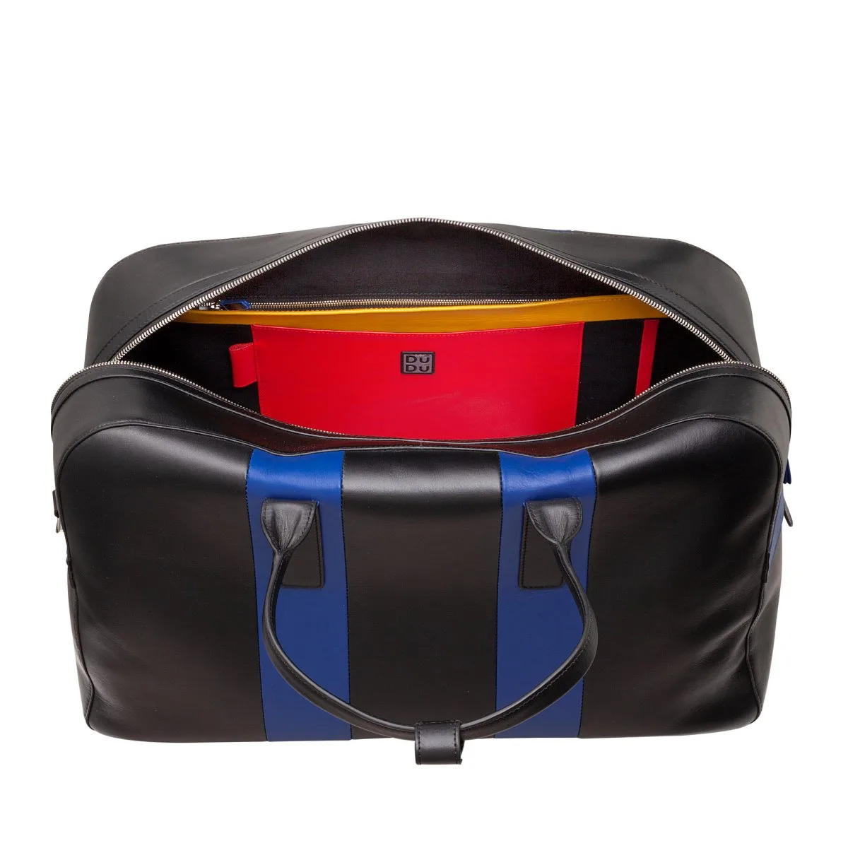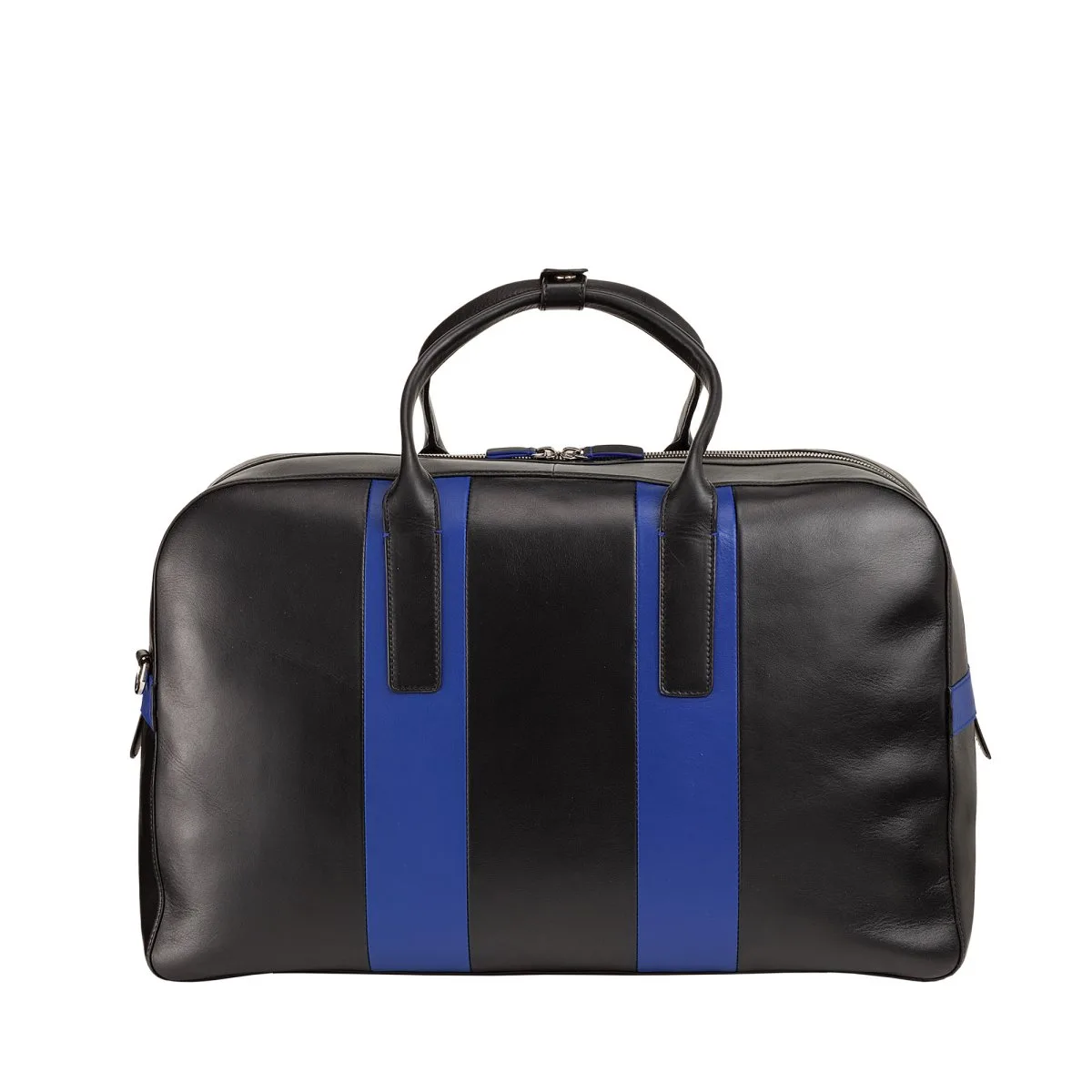 Diese bequeme Reisetasche aus Leder ist die ideale Wahl bei Kurzurlaub oder Tagesausflüge, aber auch für das Fitnessstudio. Sie verfügt über ein großes Innen- und ein geräumiges Reißverschlussfach, lässt sich bequem mit den Griffen in der Hand oder mit dem – auch abnehmbaren – Trageriemen über der Schulter tragen. Farbig akzentuierter und verstärkter Boden mit Metallnoppen. Allgemeine Ausstattung: 4 Außenfächer, 1 Schlüsselring, 1 Stifttasche und 1 Innentasche mit Reißverschluss. Schulterriemenlänge: 132 cm