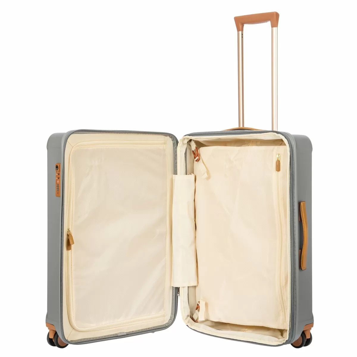 – AUSSEN: Schale aus Polycarbonat, flexibel und widerstandsfähig, mit Details aus Rindsleder mit Kontrastnähten. Das TSA-Schloss am Reißverschluss ist in die Schale integriert. Mit einem Reißverschluss lässt sich die Tiefe des Trolleys um 4 cm erweitern.