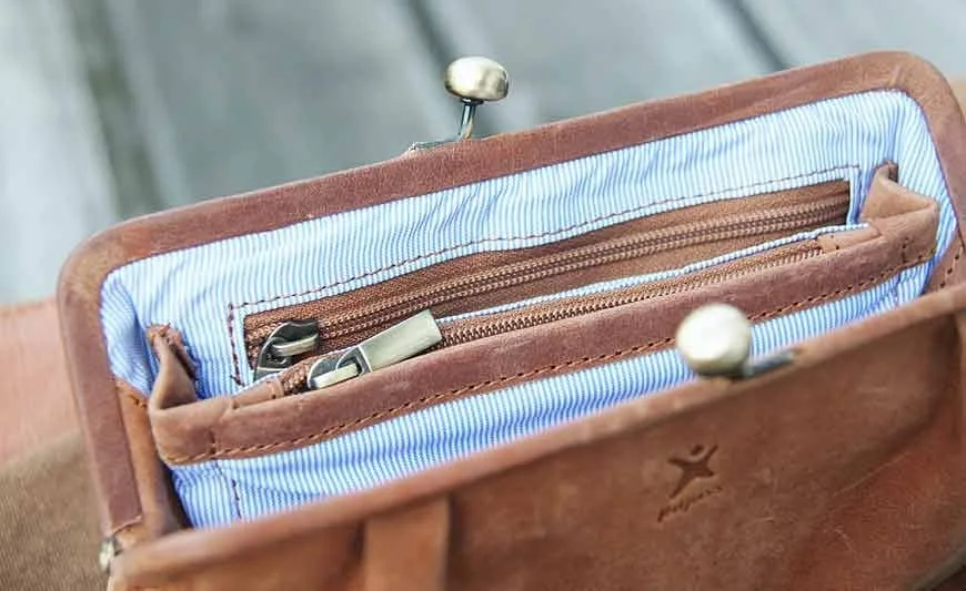 Details: Exklusives ECO-Leder, handgefertigt in einem Sozialprojekt. 2 Fächer mit Reissverschluss, 3 Kreditkartenfächer, eleganter Bügelverschluss,