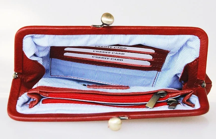 Details: Exklusives ECO-Leder, handgefertigt in einem Sozialprojekt. 2 Fächer mit Reissverschluss, 3 Kreditkartenfächer, eleganter Bügelverschluss,