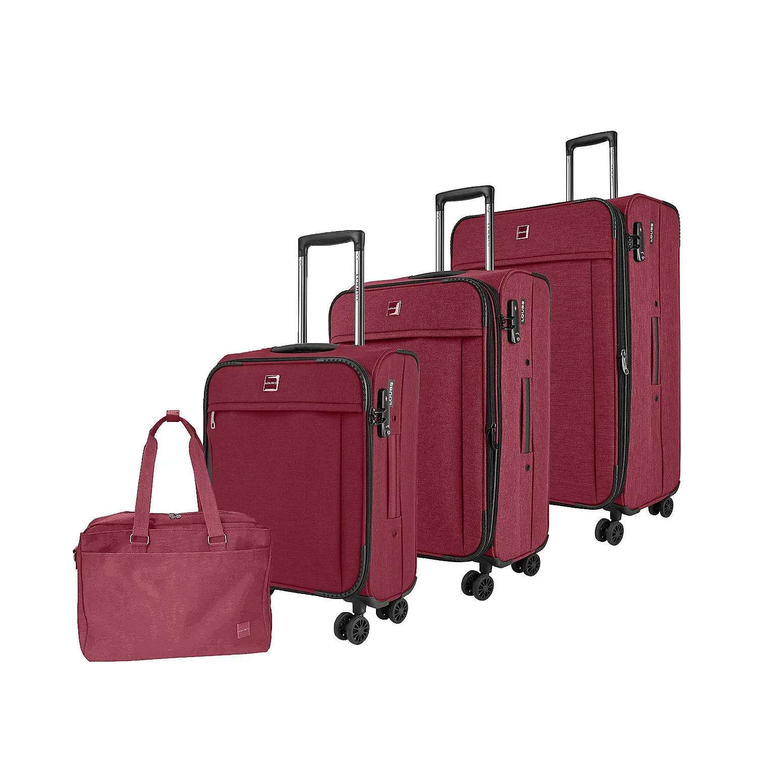 Mit dem vierteiligen Gepäckset Darwin von Assima Loubs sind Sie für jedes Reisevorhaben bestens gerüstet. Sowohl die drei Koffer in den Größen S, M und L als auch der praktische Shopper im passenden Design sind aus widerstandsfähigem Polyestermaterial gefertigt, dem seine leichte Melierung einen modernen Look verleiht. Der kleinste Trolley hat ideale Bordgepäckmaße, während die Trolleys in M und L mit einer praktischen Dehnfalte ausgestattet sind. So lässt sich bei Bedarf auch leicht etwas mehr Gepäck unterbringen. Ergänzt wird das smarte Kofferset durch einen vielseitig einsetzbaren Shopper. Ausgerüstet mit einem integrierten Laptopfach, lässt sich in dieser Tasche auch empfindliches, elektronisches Equipment geschützt transportieren.