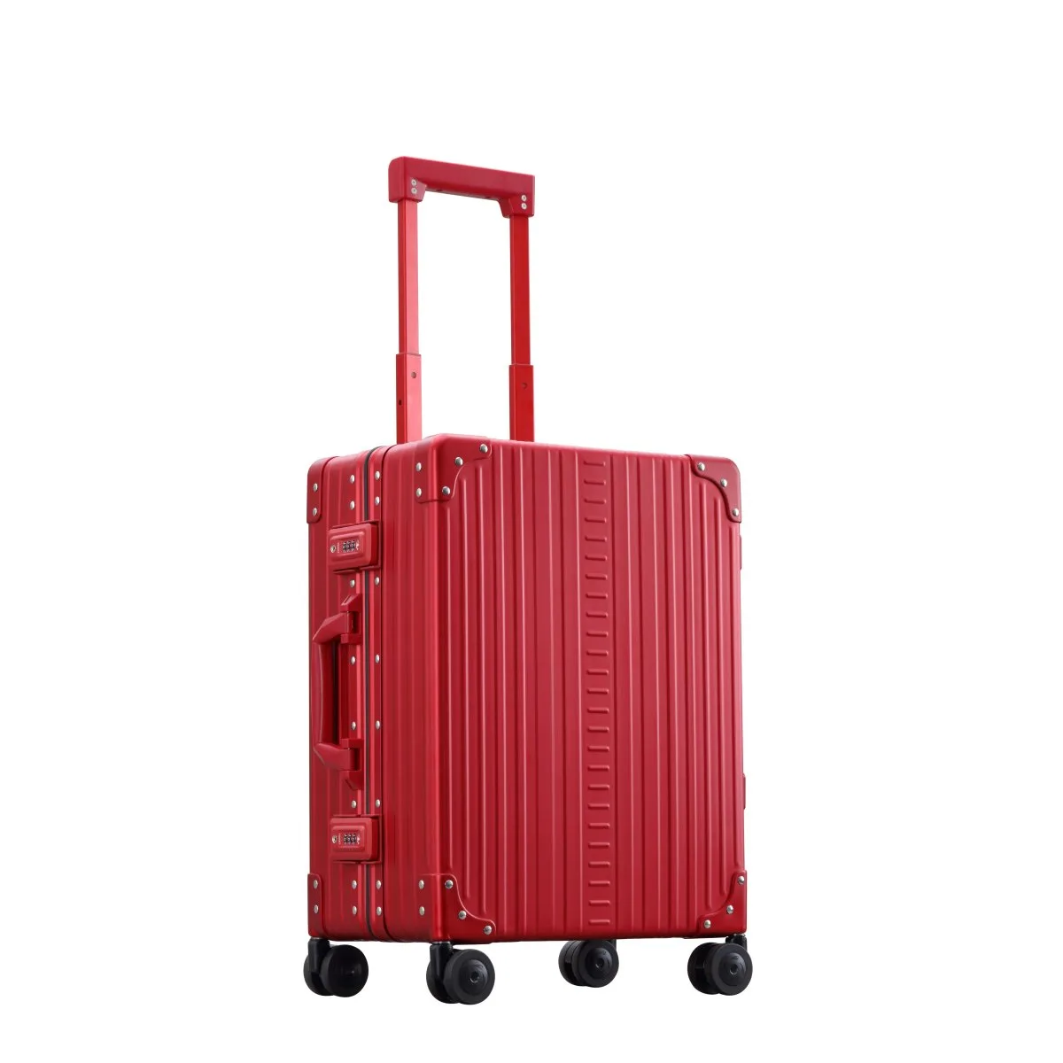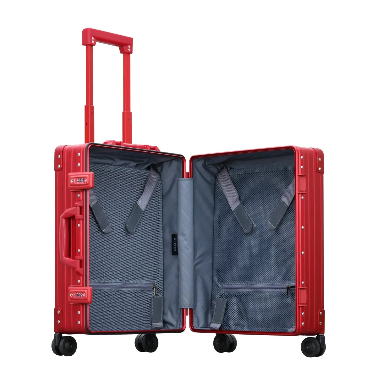 Kofferschalen aus eloxiertem Aluminium mit doppelt verstärkten Aluminiumecken, zwei zurücksetzbare TSA-Kombinationsschlösser, vier hochwertige Doppellaufrollen, innenliegende Gummidichtung sowie wasserabweisendes beschichtetes Polyesterfutter. Inneres Kompressions-Verpackungssystem, grosser gepolsterter Verpackungswürfel im Deckel.