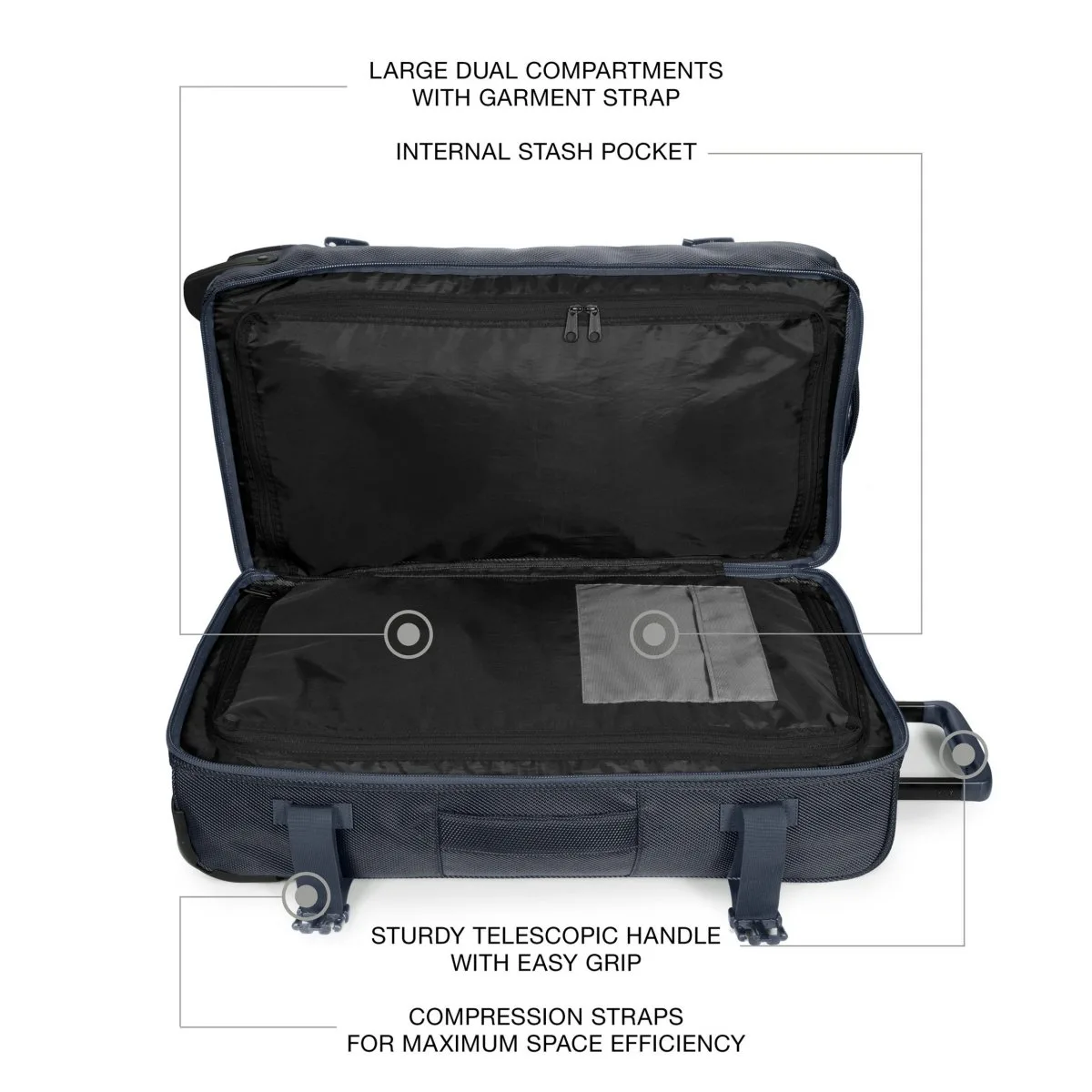 – Teleskopgriff, leichtgängiges Rollensystem und integriertes dreistelliges TSA-Codeschloss