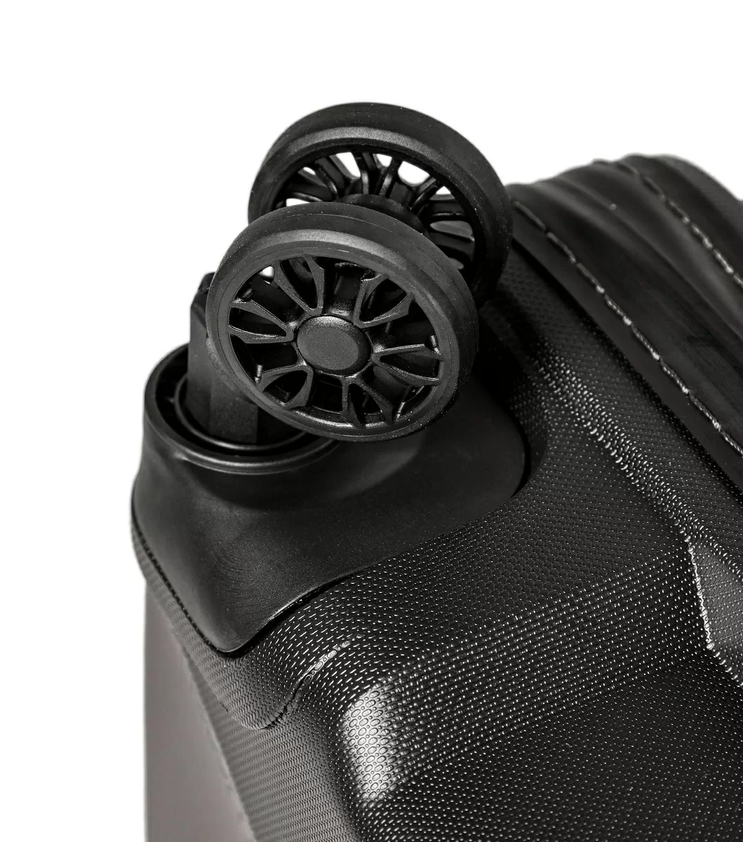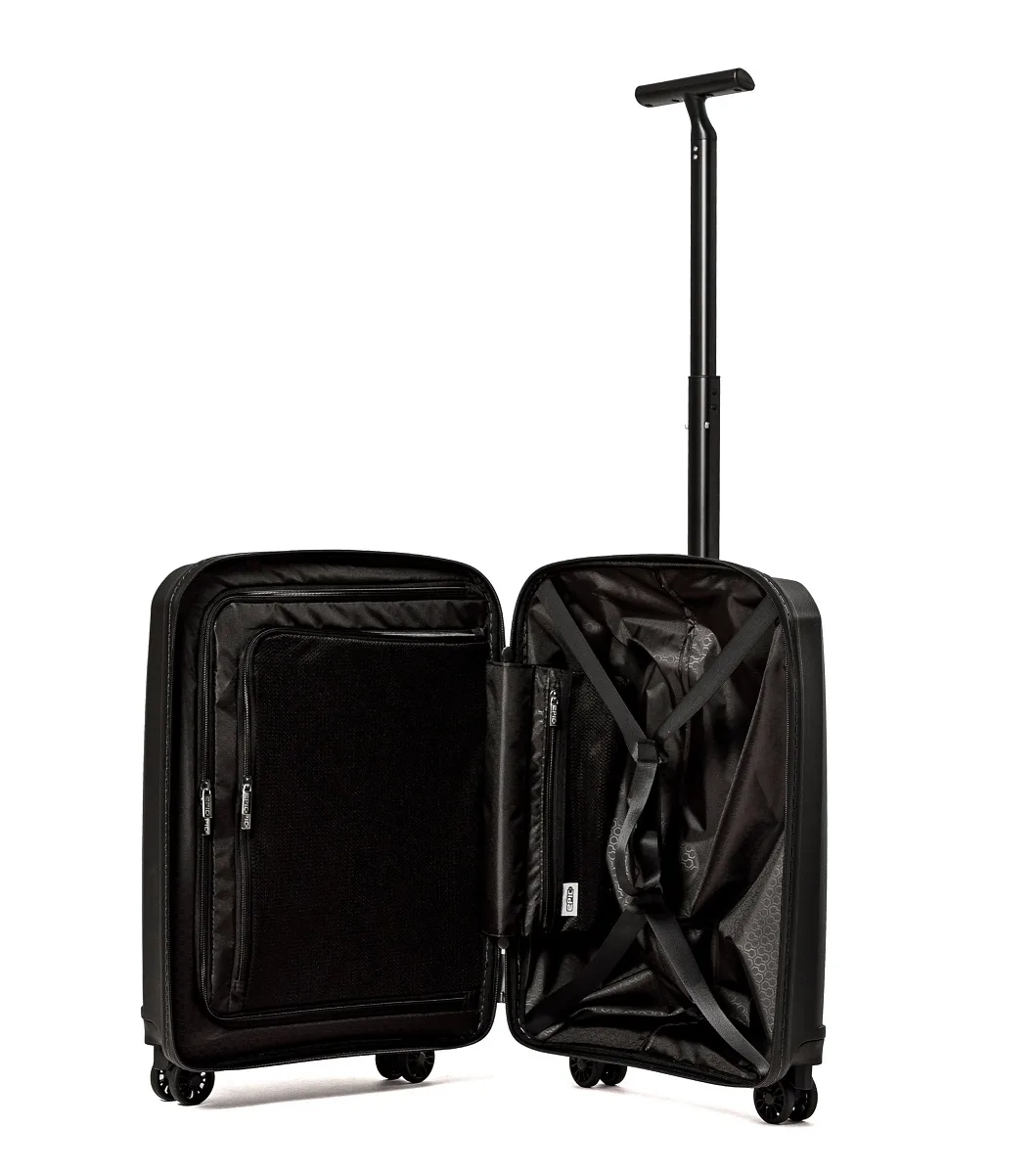 Ultraleichter 4-Rollen-Trolley mit Leiselaufrollen, flachintegriertem TSA Schloss, beidseitig Spannpackgurt, mit zusätzlicher Reissverschlusstasche, Accessories-Reissverschlusstasche und grosszügigem Laptop-Zusatzfach, integriert in der vorderen Aussenhülle.