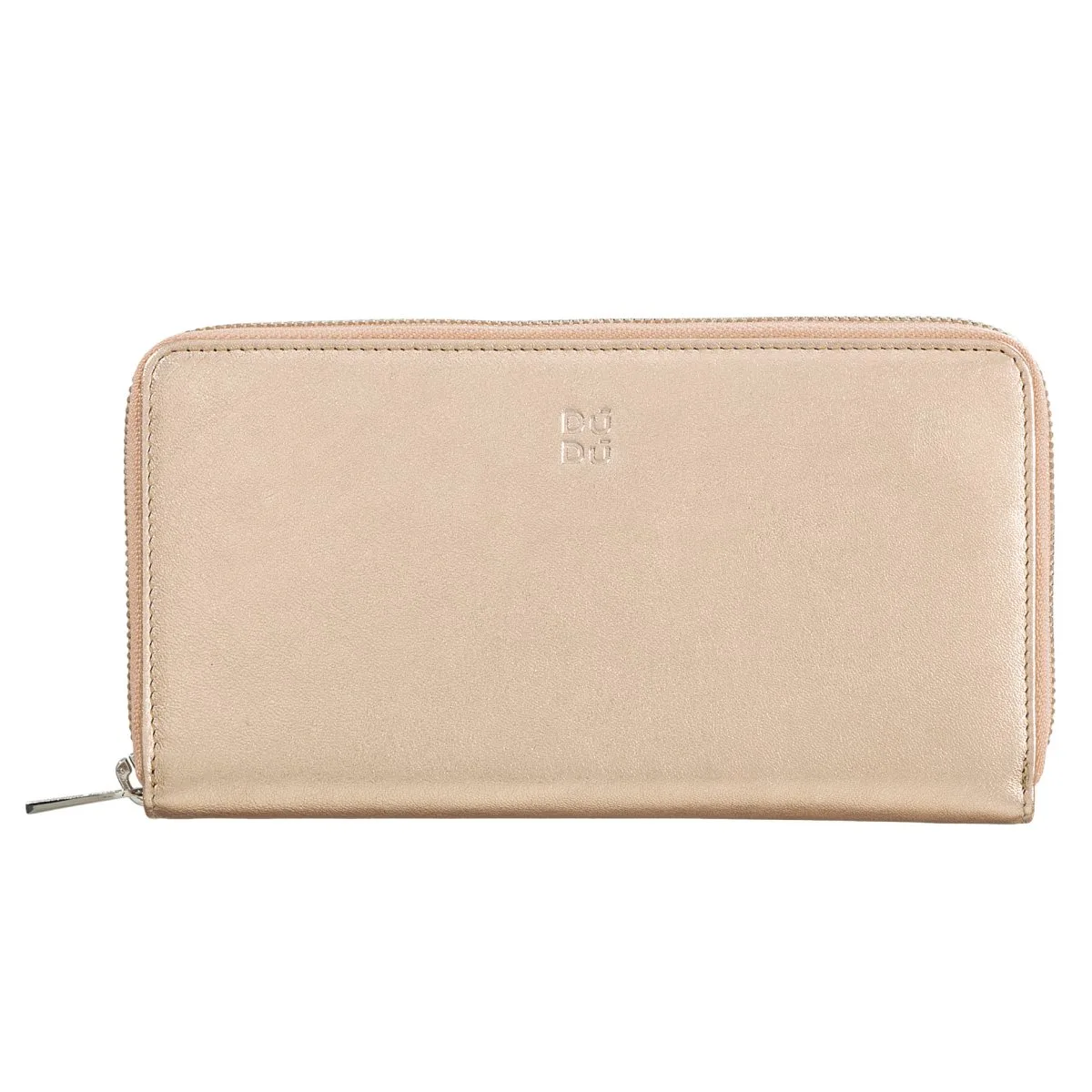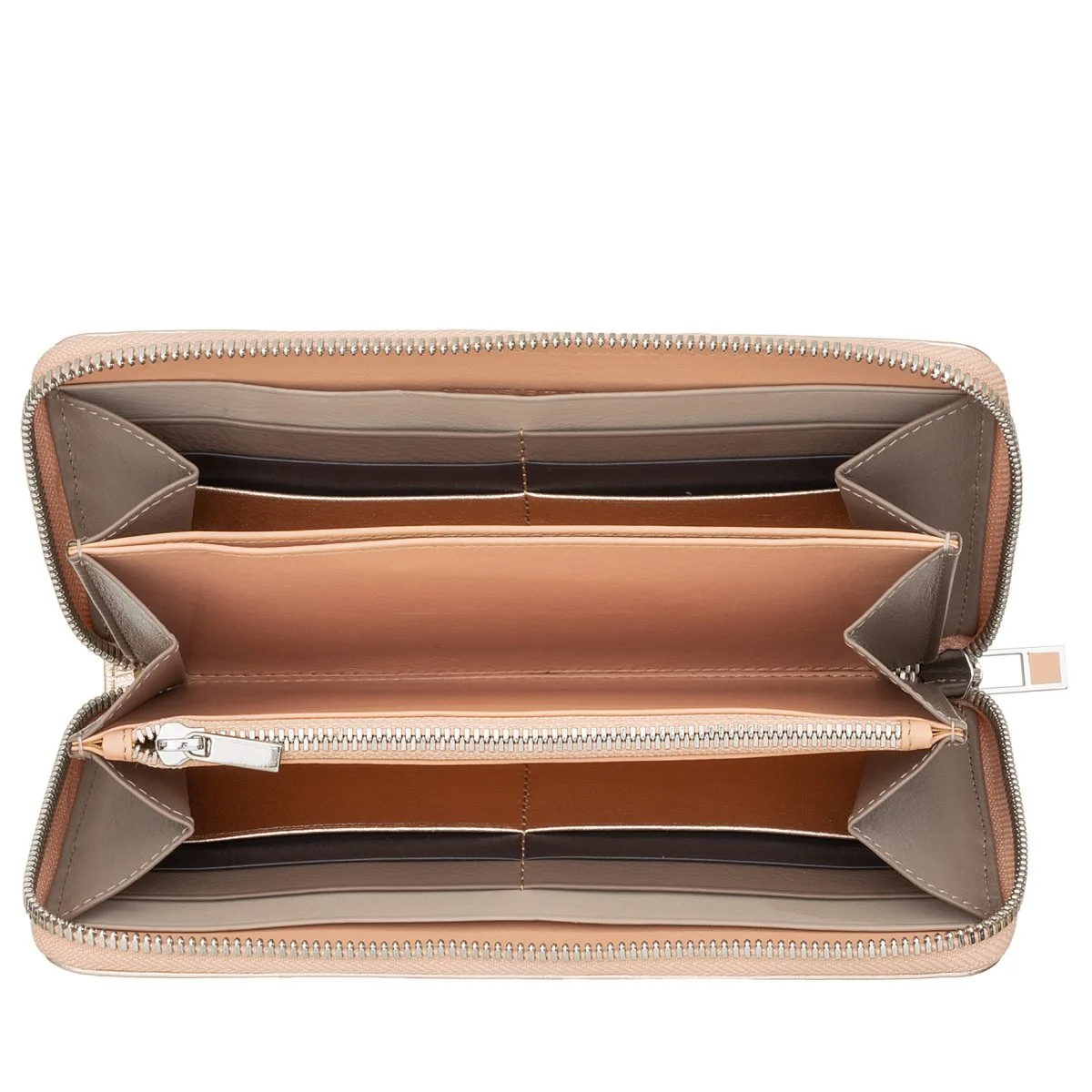 Mehrfarbige Damenbrieftasche RFID mit „rundum-Reißverschluss“ in echtem weichem Kalbsleder. Unterteilt in 3 eingefaltete Fächer mit Kartensteckfächer und Münzfach, Farbkontrast innen.