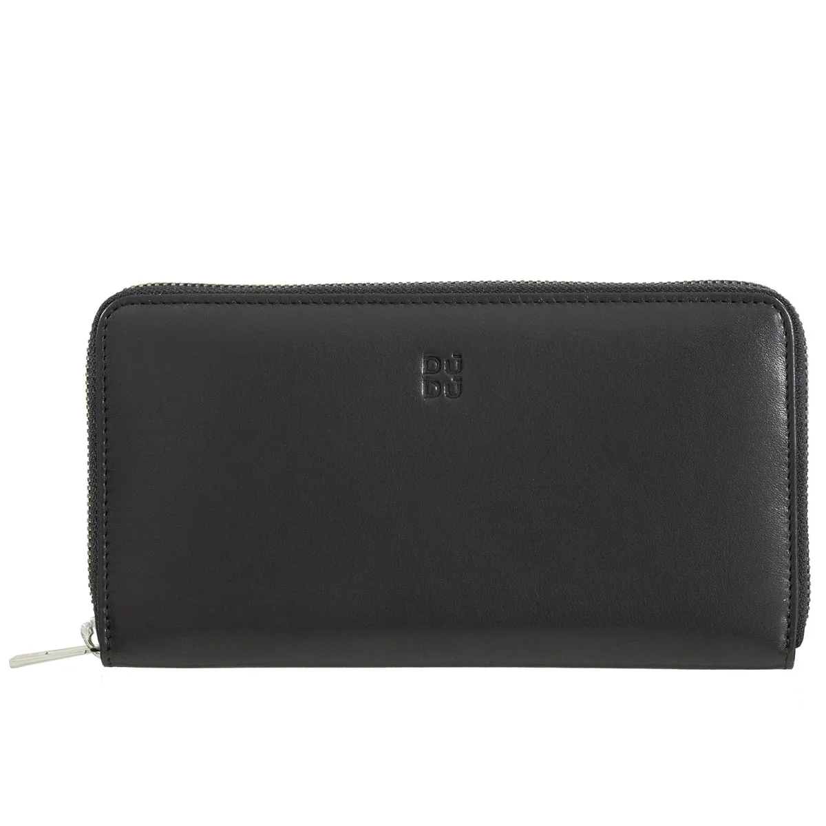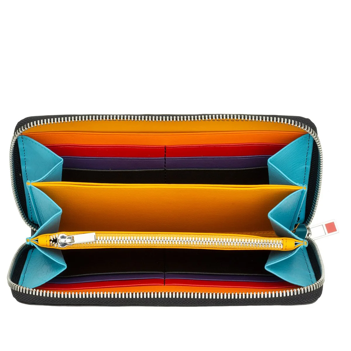 Mehrfarbige Damenbrieftasche RFID mit „rundum-Reißverschluss“ in echtem weichem Kalbsleder. Unterteilt in 3 eingefaltete Fächer mit Kartensteckfächer und Münzfach, Farbkontrast innen