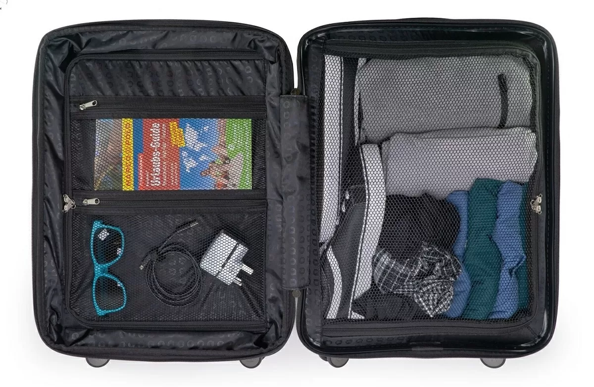 – Praktisches Interieur: Eine RV-Netztrennwand stabilisiert das Reisegepäck. Ein RV-Zwischenboden (+ 2 RV-Netztaschen für Utensilien) sowie die RV-Netztrennwand teilen den Koffer in 3 Kompartiments. Das elegante Interieur besteht aus reißfestem Polyester und ist äußerst pflegeleicht.