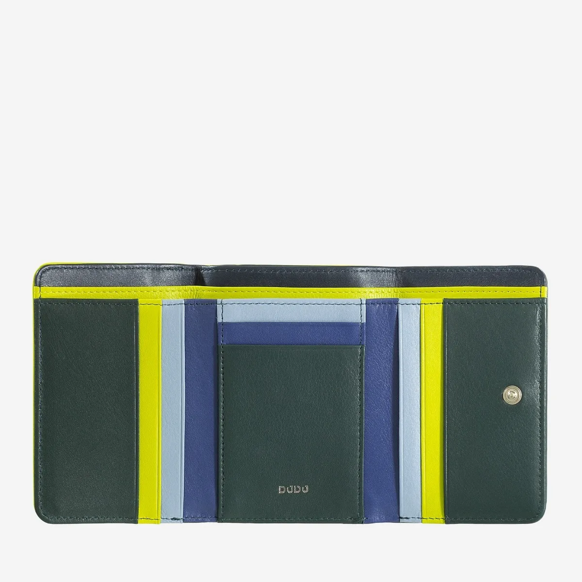 Kleine dreifach-gefaltete, mehrfarbige Brieftasche (RFID). Mehrere Kartensteckfächer und externes Münzfach mit Reißverschluss unterteilt in 2 eingefalteten Fächern. Gefertigt in echtem, weichem Kalbsleder. DuDu Logo und Nähte in dezentem Kontrast.
