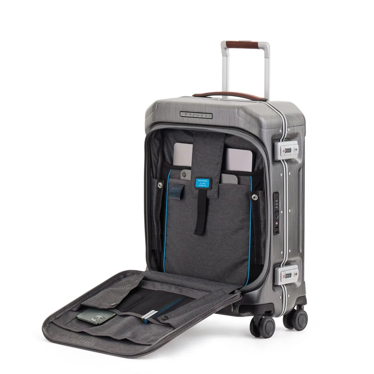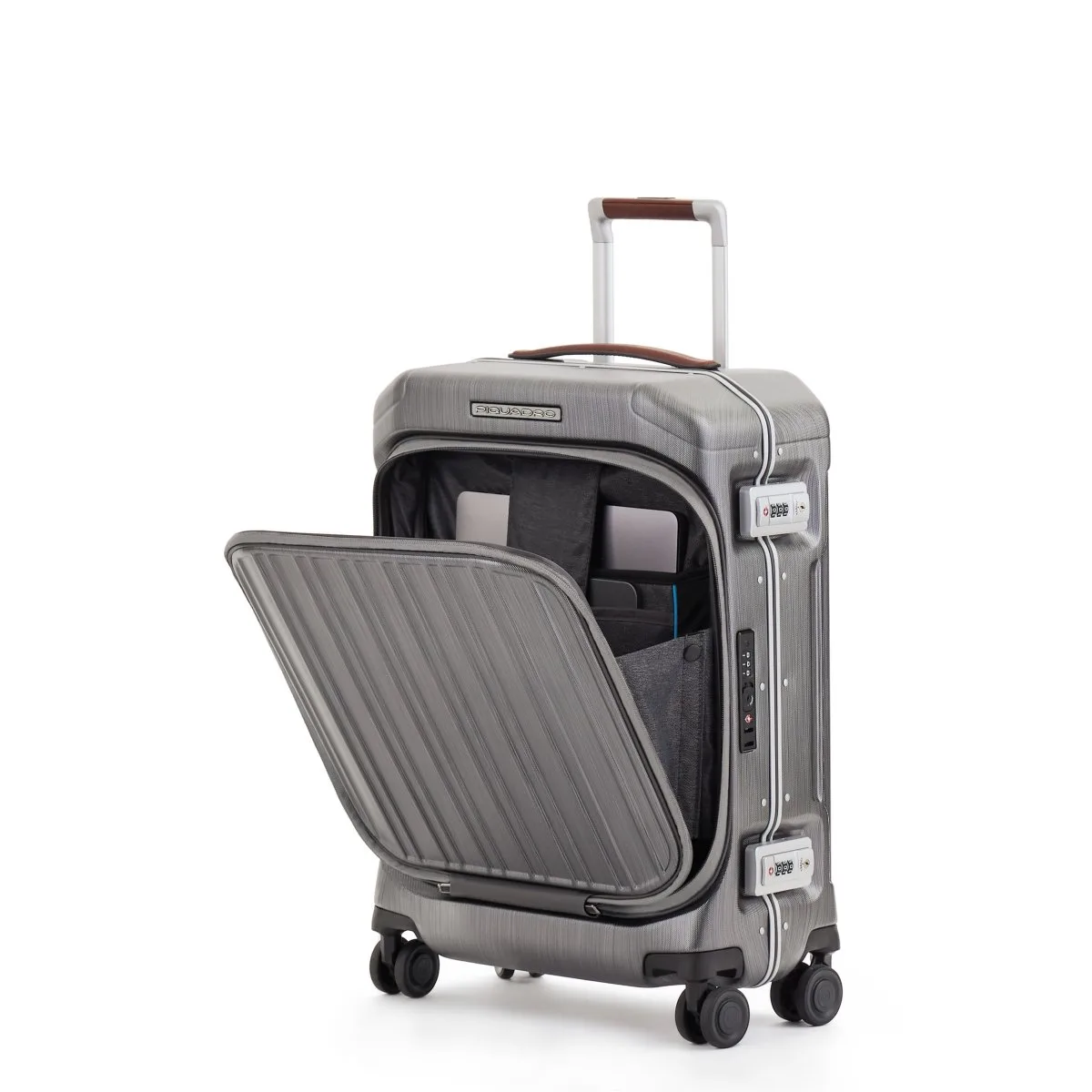 Der Trolley besteht aus robusten, kratzfestem Polycarbonat im Metallic-Look und wurde in Flammungen hergestellt. Das Trolley-System mit Alu-Griff und Innenfächern wird mit Leder-Einsätzen optisch aufgewertet. Der Fast-Check Hartschalentrolley von Piquadro in Handgepäckgröße mit vier-Rollen, Doppelgestänge und versenkbaren Griffen. TSA Schloss, Adressschild. Mit dem Tablet-sleeve und dem Laptopfach ist er der Koffer für Businessreisen schlechthin.