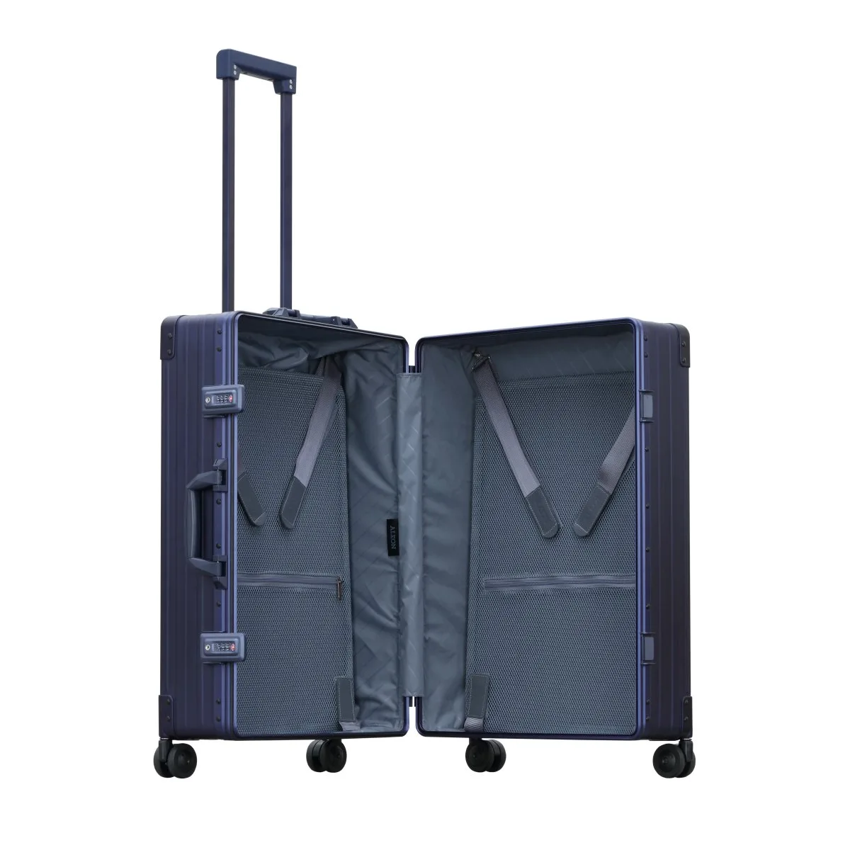 Dieser äusserst robuste Trolley besteht aus Flugzeugaluminium, das besonders langlebig und leicht ist und mit seiner genieteten Konstruktion sowie doppelt verstärkten Ecken für zusätzliche Stabilität sorgt. Zwei TSA Schlösser sorgen dafür, dass der Kofferinhalt stets sicher und geschützt bleibt. Eine eingebaute, nahtlose Gummidichtung macht das Gehäuse wasserdicht und hält Feuchtigkeit und Schmutz fern. Aleons Innenfutter ist schmutz- und wasserabweisend mit einem nicht abrasiv beschichteten Polyestergewebe, das den Gegenständen keinen Schaden zufügt.