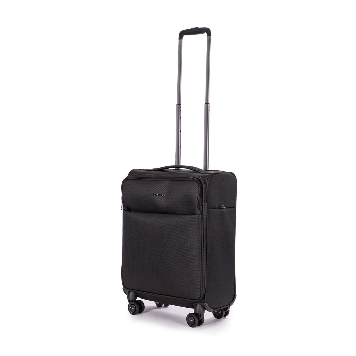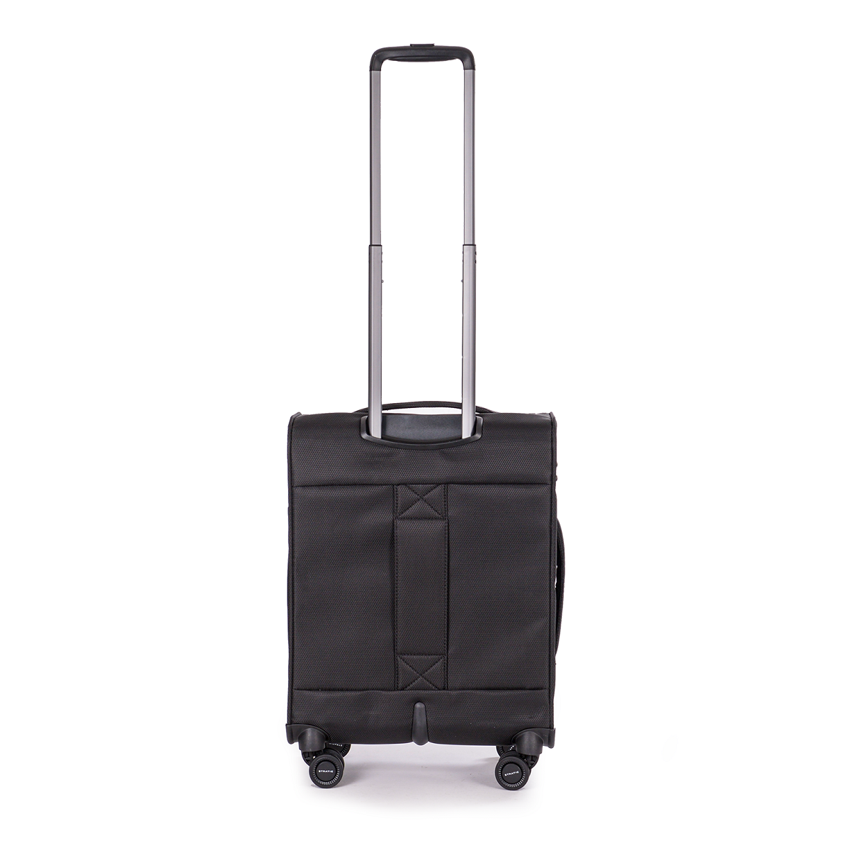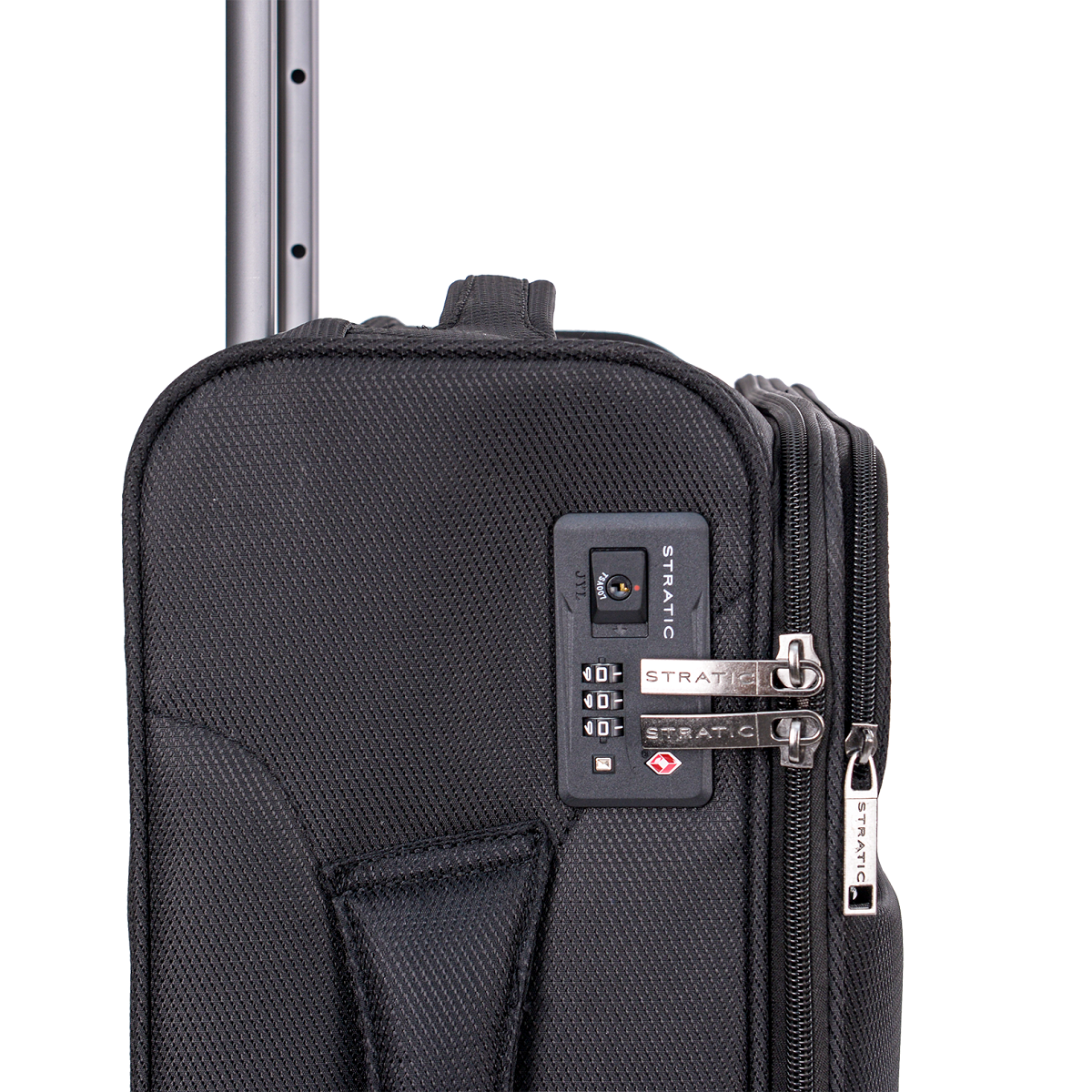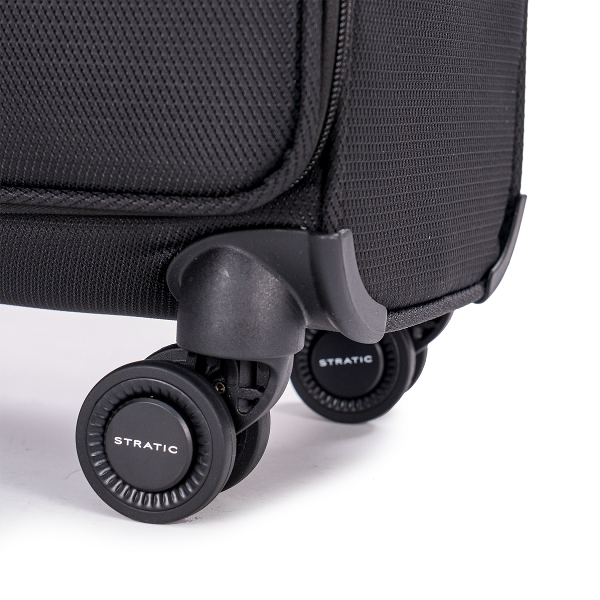 Ein leichtläufiges 4-Doppelrollensystem, getestet auf 25km, und ein ergonomisch geformter Griff, an einem 4-fach ausziehbaren Aluminium-Teleskopgestänge, lassen den super leichten STRATIC LIGHT+-Koffer, Größe S, sehr komfortabel führen und auch voll bepackt ist er so sehr wendig und leichtläufig. Das sehr geräumige Hauptfach des STRATIC LIGHT+ ist mit fein gewebtem Polyester und einem hochwertigen Reißverschluss mit Metallanfasser ausgestattet. Im Kofferinnenraum befinden sich ein großzügiges Hauptfach mit hoch belastbaren Kreuzspanngurten sowie ein Reißverschluss-Netzfach im Deckel des Koffers für flache Utensilien. Die Ausstattung mit einem TSA-Schloss für Reisen in die USA und Großbritannien ist selbstverständlich. Es ist durch den Zoll einfach ohne Aufbruch zu öffnen. Tragegriffe sind an der Kofferoberseite und seitlich des Koffers vorhanden. Neu ist die Ausstattung mit dem STRATIC CONNECT NFC-Chip.