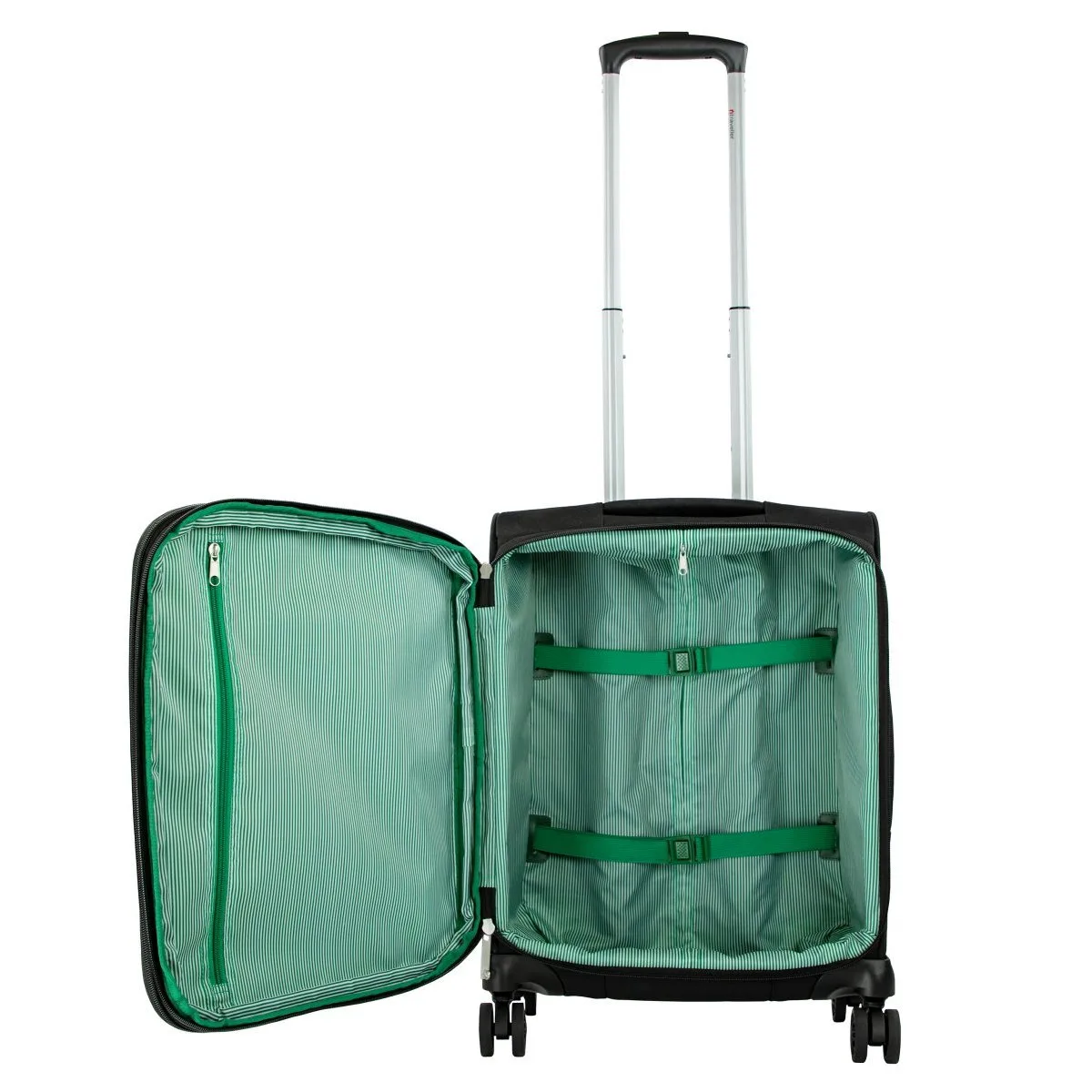 Der Trolley verfügt über 4 besonders leise Doppelrollen, ein integriertes TSA-Schloss, eine ausziehbare Teleskopstange, sowie einen oberen und seitlichen Tragegriff. Auf der Unterseite befindet sich zusätzlich eine Grifflasche. So wird das Verstauen, zum Beispiel im Zug, zum Kinderspiel. Im Inneren des Koffers sorgen elastische Kreuzspanngurte und ein Reißverschlussfach für Ordnung. Außerdem ist das Volumen des Koffers erweiterbar,