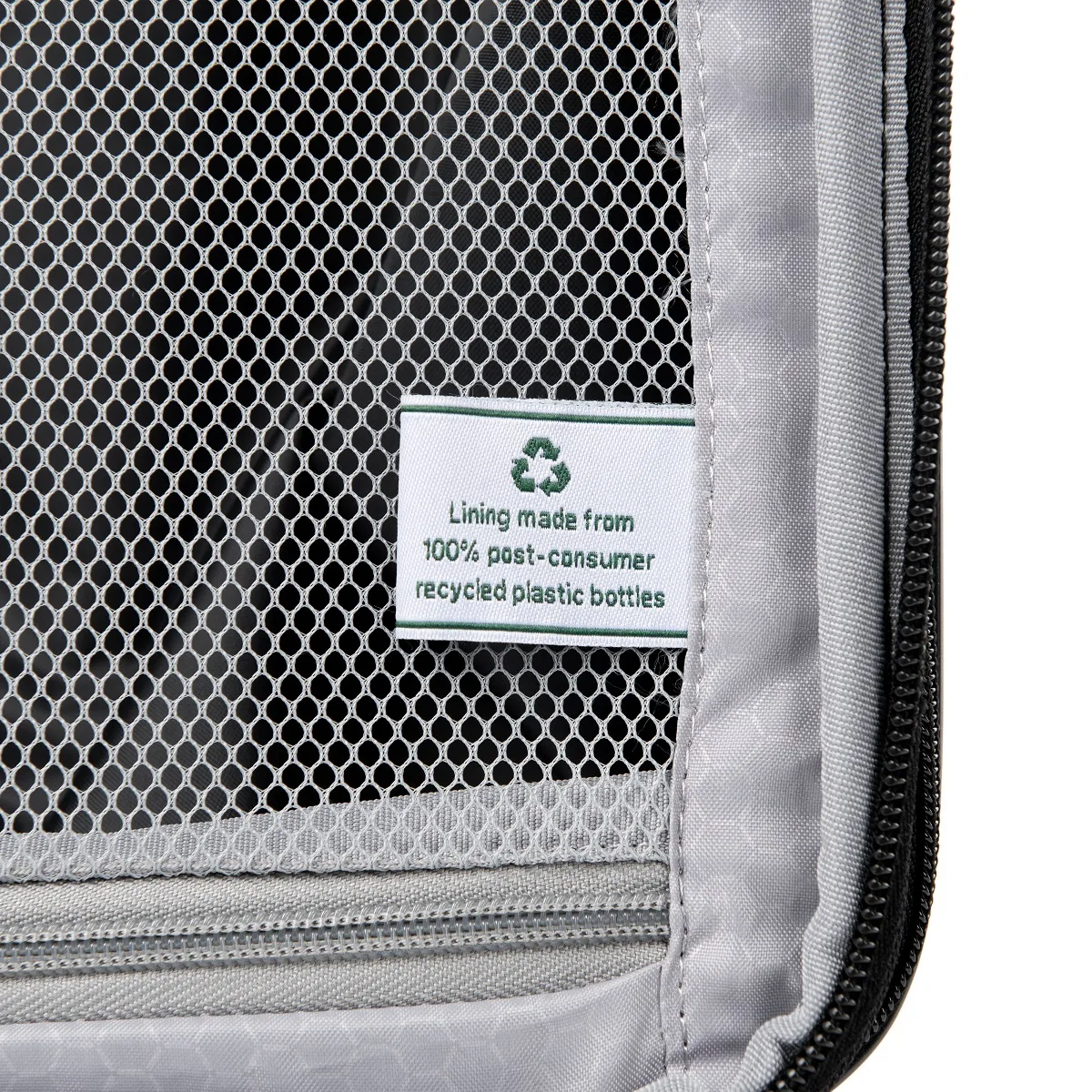 - Innere Trennwände mit Reißverschluss sorgen für Ordnung, Trennung und Sicherheit des Inhalts, während das Innenfutter zu 100 % aus recycelten Plastikflaschen besteht.