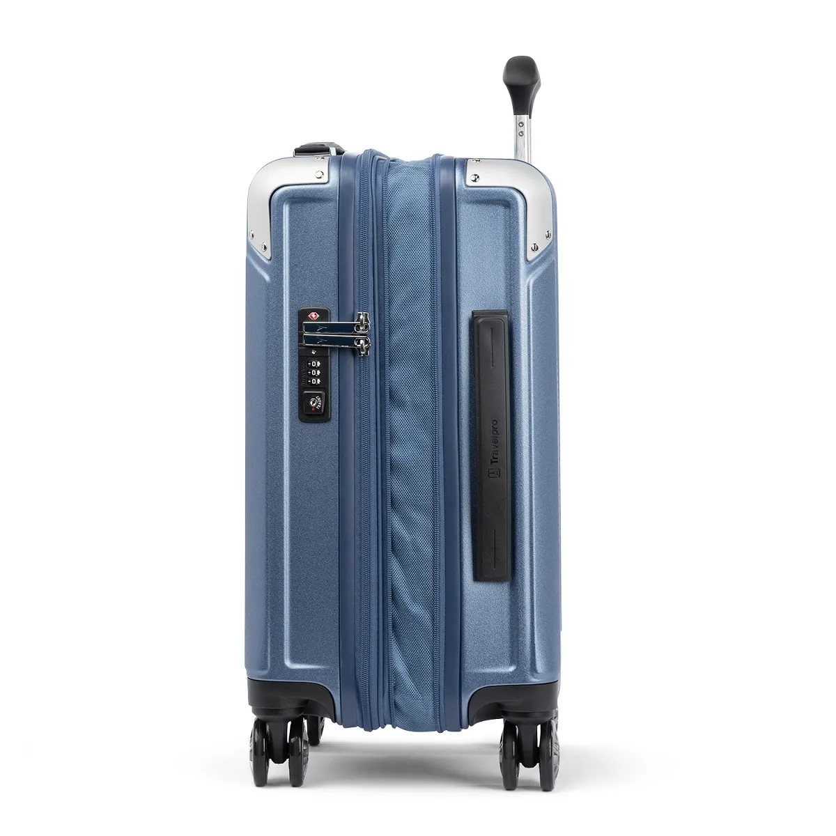 Das Clamshell-Design mit zwei Trennwänden mit Reißverschluss sorgt dafür, dass der Inhalt getrennt und sicher aufbewahrt werden kann. Mehrere Zubehörtaschen sorgen für Ordnung und eine praktische, wasserfeste Tasche bietet Platz für feuchte Gegenstände oder Toilettenartikel. Unterwegs fliegt diese kompakte Schönheit mit präziser Kontrolle und mühelosem Rollen, dank des exklusiven PrecisionGlide™-Systems von Travelpro® – acht selbstausrichtende MagnaTrac®-Spinner-Räder, die von einem robusten, vierfach verstellbaren PowerScope Lite-Griff mit komfortablem Contour Grip geführt werden.